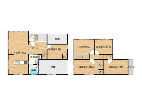 1階:LDL約17帖 洋室約5.5帖 水洗 浴室 洗面 車庫