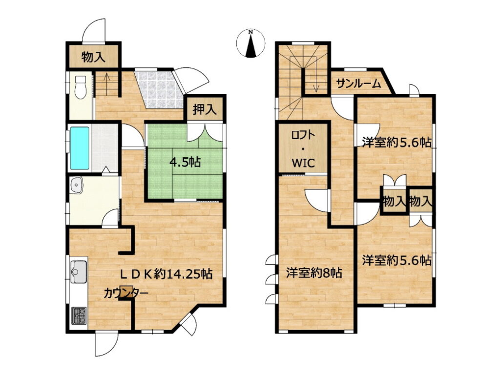 1階:LDK約14.25帖 和室4.5帖 浴室 水洗 洗面