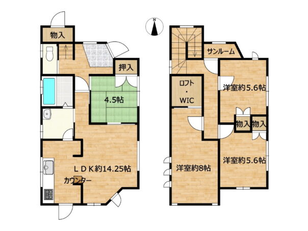 2階:洋室約8帖+WIC・ロフト 洋室約5.6帖×2室 サンルーム