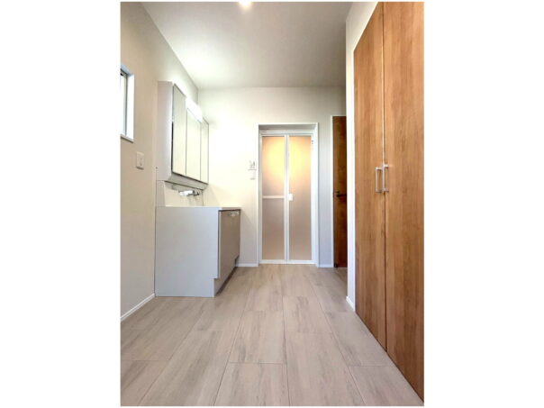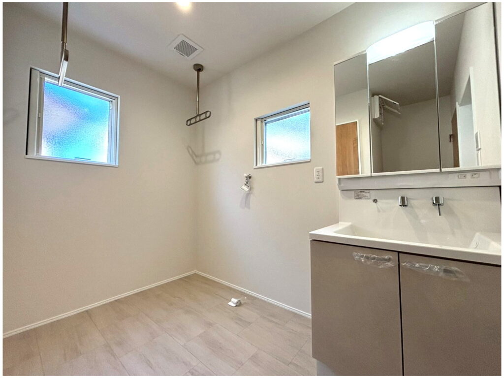 大きな洗面脱衣所兼サンルームがあることによって、1階で家事が完結します。
