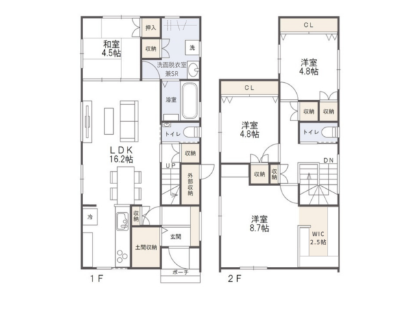 2階:洋室8.7帖+WIC3帖 洋室4.8帖×2室 水洗