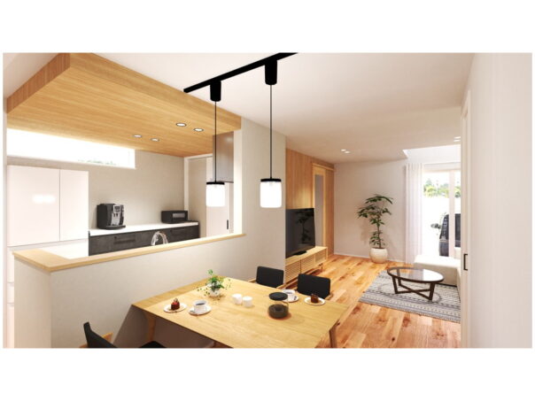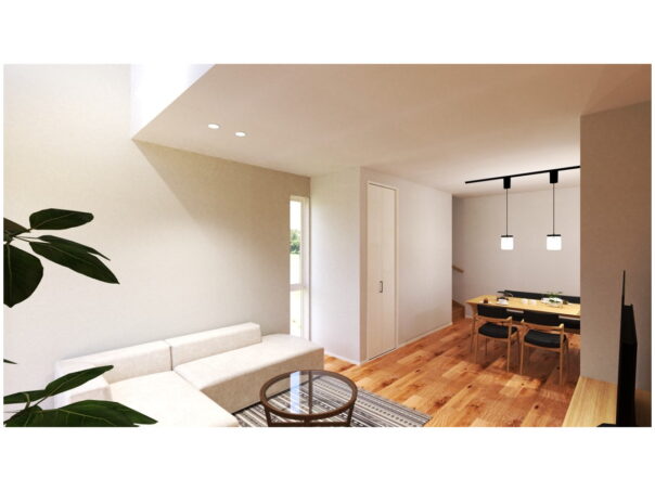 LDKは18.2帖で、天井高も2.5mのため圧迫感なく過ごせます。さらに吹抜があることで、帖数以上の開放感を感じられます。吹抜の上部には2階の多目的スペースが隣接し家族とのつながりを感じながらも、程よい距離感でリモートワークや読書スペースに活用できます。