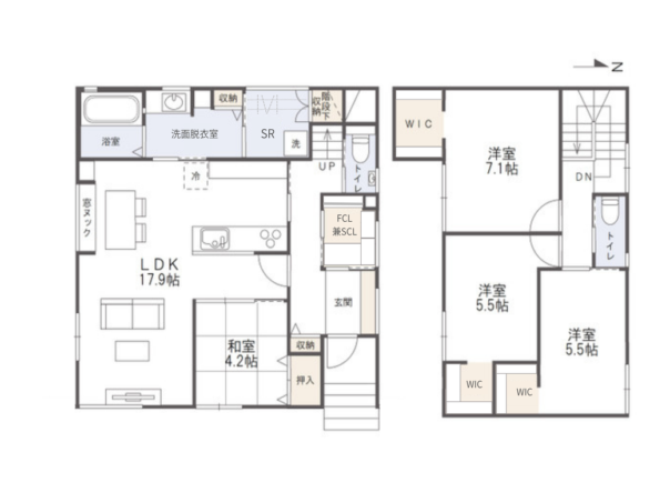 2階:洋室7.1帖+WIC 洋室+5.5帖+WIC×2 水洗