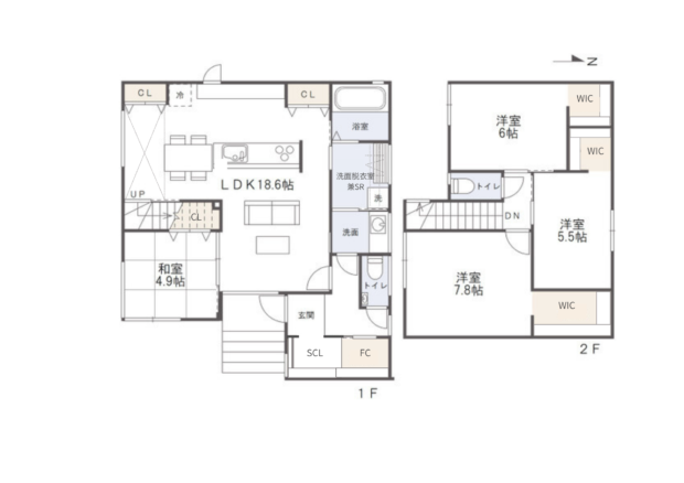 2階:洋室7.8帖+WIC 洋室6帖+WIC 洋室5.5帖+WIC 水洗