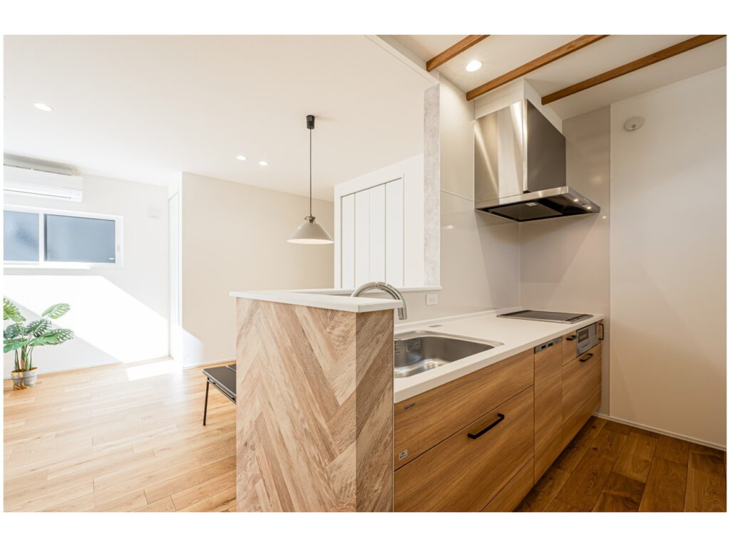 キッチン上部の化粧梁が、よくイメージするシンプルな分譲住宅とは一味違う