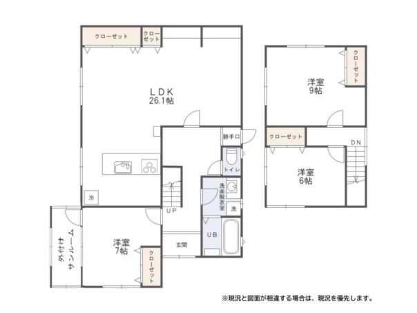 1階:LDK26.1帖 洋室7帖 洗面 浴室 水洗