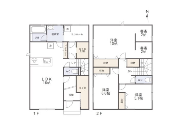 2階:洋室10帖 書斎2帖×2 洋室6.6帖 洋室5.1帖 水洗