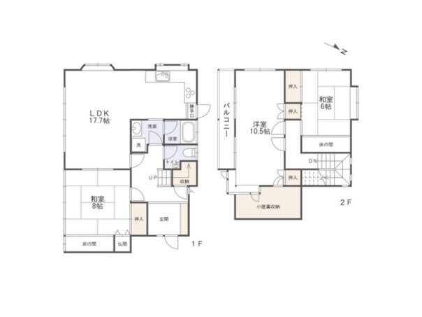 2階:洋室10.5帖 和室6帖 小屋裏収納 バルコニー