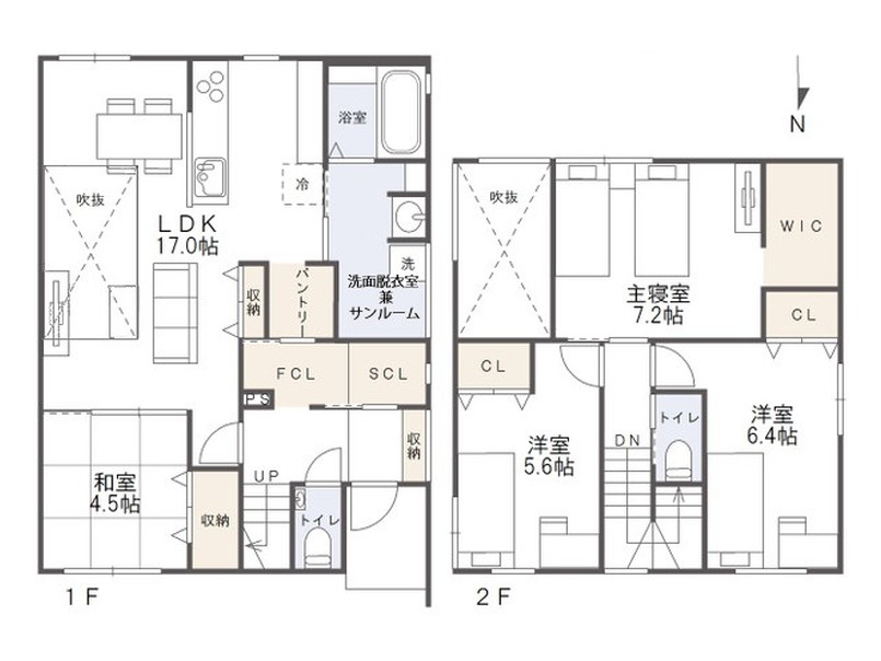 1階:LDK17帖 和室4.5帖 水洗 浴室 洗面脱衣室兼サンルーム ファミリークローゼット シューズインクローゼット パントリー