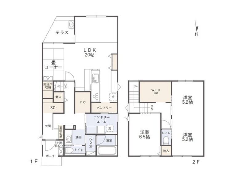2階:洋室6.5帖 洋室5.2帖×2室 WIC3帖 水洗