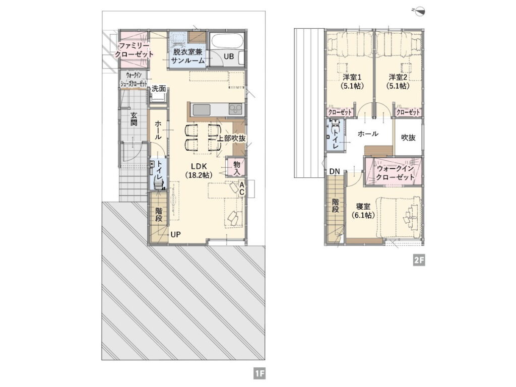 ファミリークローゼットや1階サンルームなどの人気の間取りを取り入れ