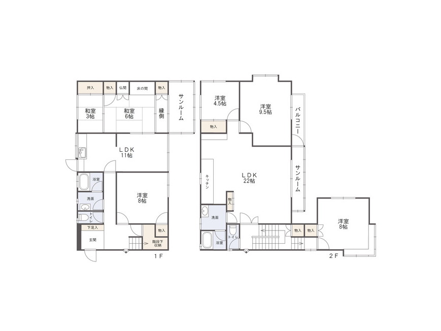 2階:LDK22帖 洋室9.5帖 洋室4.5帖 洋室8帖 水洗 浴室 洗面 サンルーム バルコニー