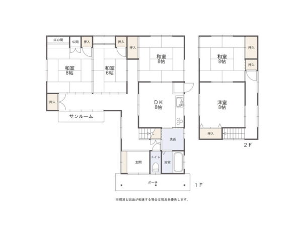 1階:DK8帖 和室8帖×2 和室6帖 洗面 水洗 浴室 サンルーム