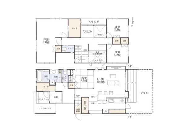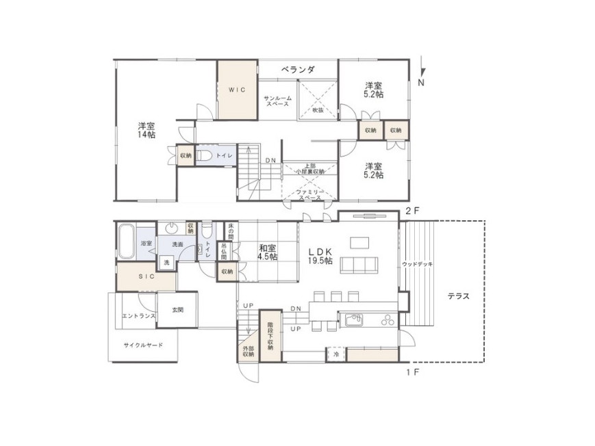 2階:洋室14帖+WIC 洋室5.2帖×2室 水洗 サンルームスペース ファミリースペース ベランダ 小屋裏収納